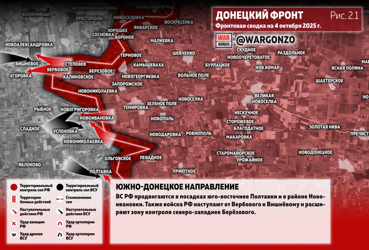На Южно-Донецком направлении ВС РФ продвигаются в посадках юго-восточнее Полтавки и в районе Новоивановки. Также войска РФ наступают от Вербового к Вишнёвому и расширяют зону контроля северо-западнее Берёзового. (Рис. 2.1)