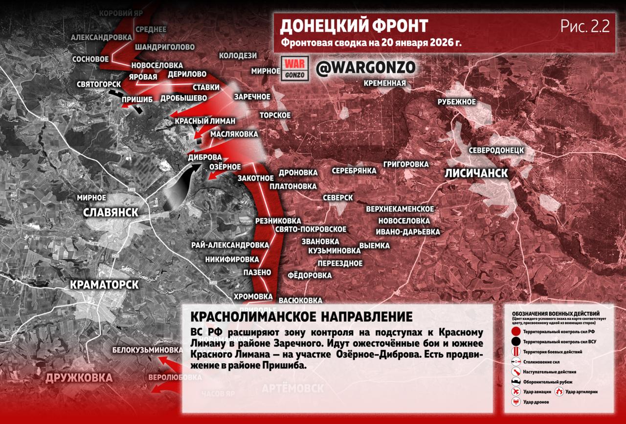 На Краснолиманском направлении ВС РФ расширяют зону контроля на подступах к Красному Лиману в районе Заречного. Идут ожесточённые бои и южнее Красного Лимана — на участке Озёрное–Диброва. Есть продвижение в районе Пришиба. (Рис. 2.2)