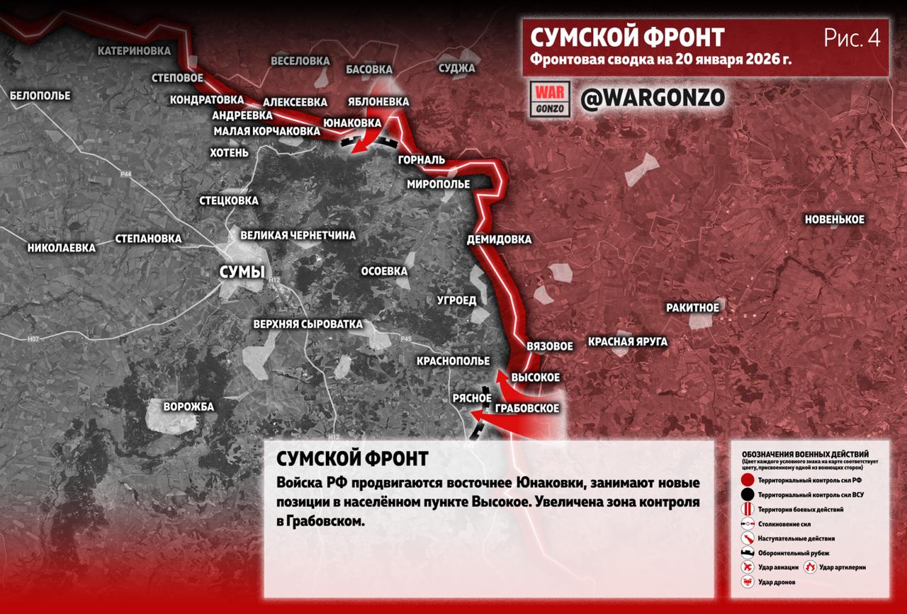 Войска РФ продвигаются восточнее Юнаковки, занимают новые позиции в населённом пункте Высокое. Увеличена зона контроля в Грабовском. (Рис. 4)