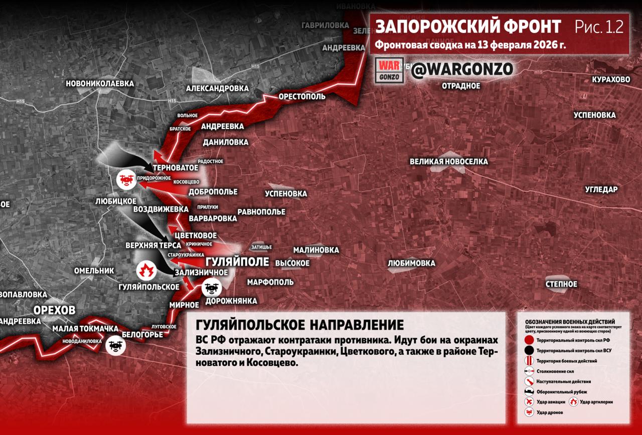 На Гуляйпольском направлении ВС РФ отражают контратаки противника. Идут бои на окраинах Зализничного, Староукраинки, Цветкового, а также в районе Терноватого и Косовцево. (Рис. 1.2)