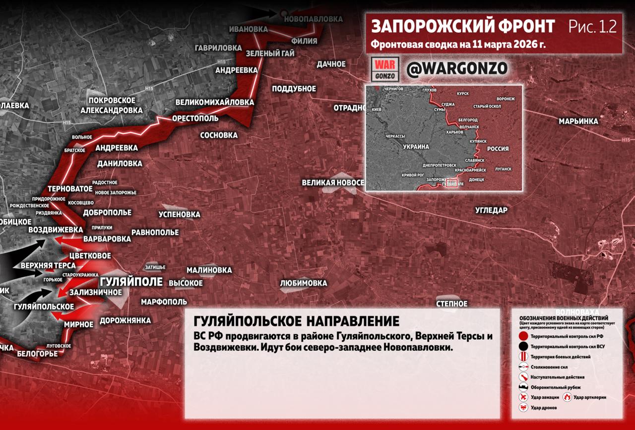 На Гуляйпольском направлении ВС РФ продвигаются в районе Гуляйпольского, Верхней Терсы и Воздвижевки. Идут бои северо-западнее Новопавловки. (Рис. 1.2)