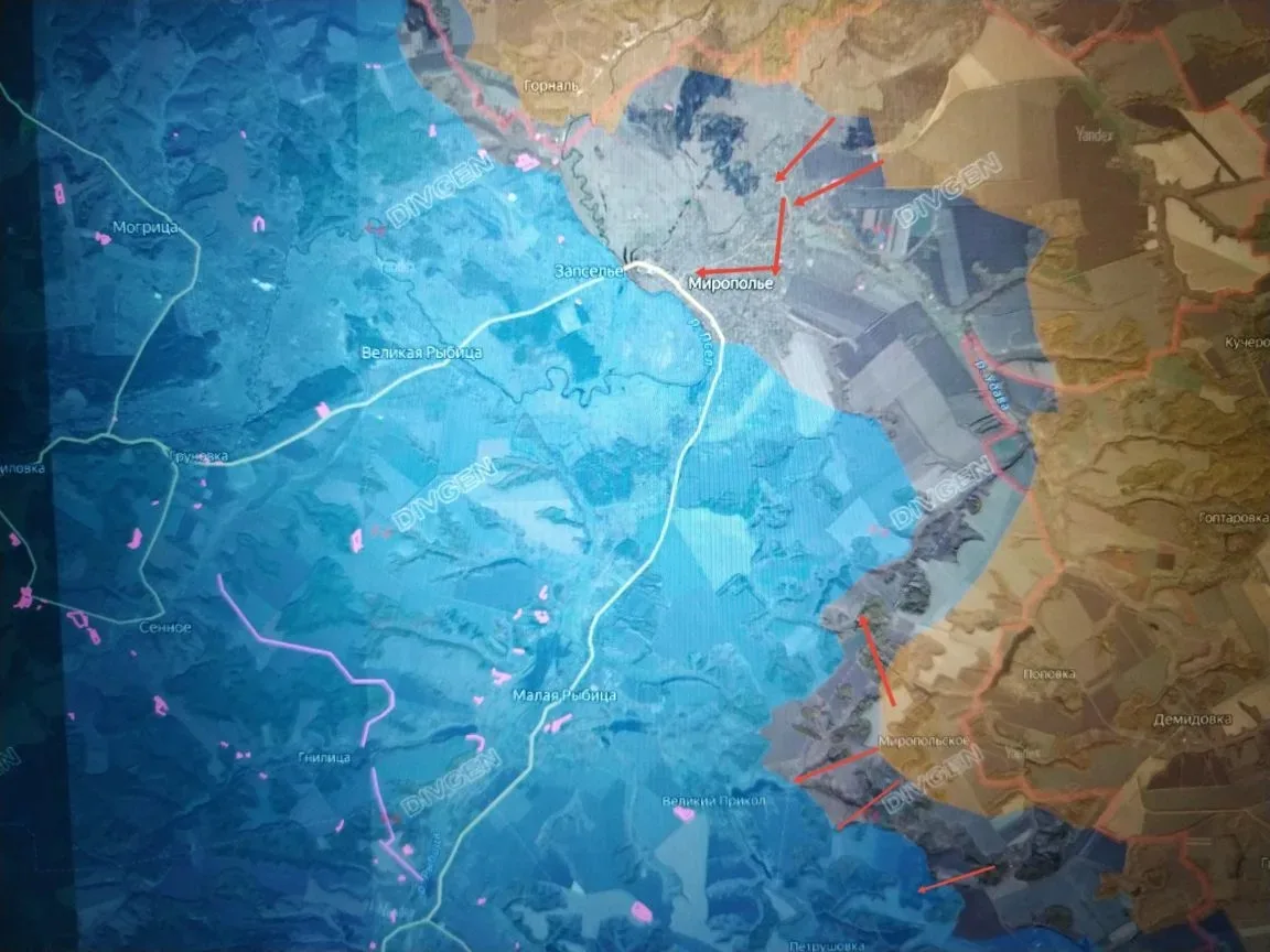 После нескольких месяцев ожесточённых боёв за Мирополье ВС РФ прорвались в его центр, взяв под контроль северную и восточную части села, и расширяют контроль в самом селе.