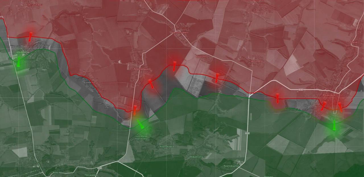 «На Сумском направлении ВС РФ зашли на восточную окраину Кондратовки, идут бои за село. Также фиксируется продвижение ВС РФ восточнее населенного пункта Алексеевка».Вражеские сводки