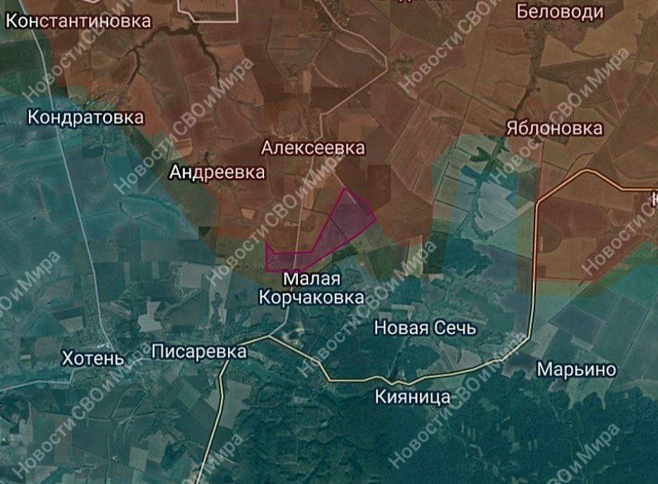 Фиксируется продвижение российской армии в направлении н.п. Малая Корчаковка, освобождено 3.1 км, сообщает канал "Новости СВО и Мира".