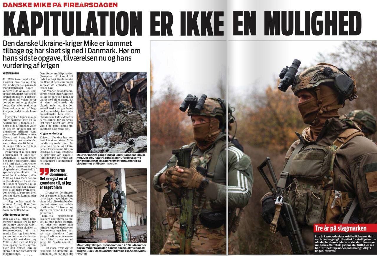 Данные заявления подтверждаются и материалами датской газеты Ekstra Bladet, известной своими радикальными взглядами, призывами к геноциду русских и развитию русофобии. В интервью с датским наёмником Майком, который три года сражался в составе украинских формирований под контролем Главного управления разведки Украины (ГУР), была озвучена информация о гибели его американского напарника в результате некомпетентных приказов командования.