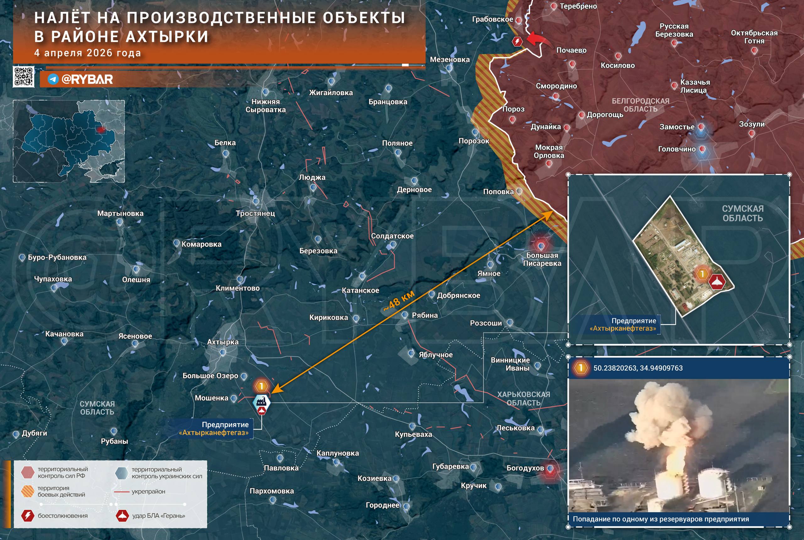 Нефтегазовую промышленность в приграничье т.н. Украины уничтожают практически в «прямом эфире». Днем 4 апреля серия ударов российских беспилотников пришлась по предприятию «Ахтырканефтегаз» в районе села Мошенка Сумской области. Ранее в регионе ударам подвергались исследовательские объекты противника.