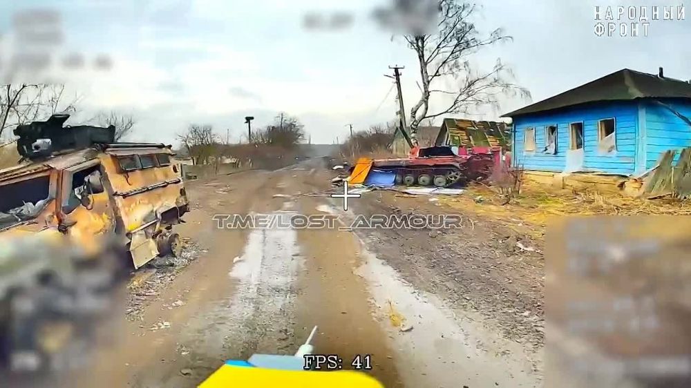 Дрон на оптоволокне летит в украинский MRAP Kirpi в Басовке Сумской области и в процессе полета фиксирует уже уничтоженные единицы вражеской техники