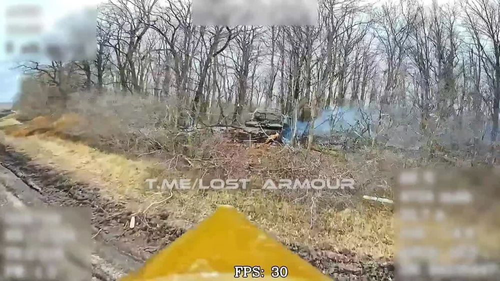 Уничтожение FPV-дронами на оптоволокне вражеского танка Т-64БВ в приграничье Сумской области, недалеко от трассы Юнаковка-Суджа. @lost_armour