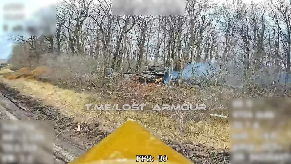 На кадрах уничтожение танка Т-64БВ ВСУ оптоволоконным FPV-дроном "КВН" в лесном массиве на территории Сумской области в 2,5 км от госграницы.