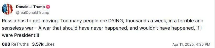 Трамп продолжает начатый уже несколько дней назад мотив: 'Россия должна начать действовать' пишет он.