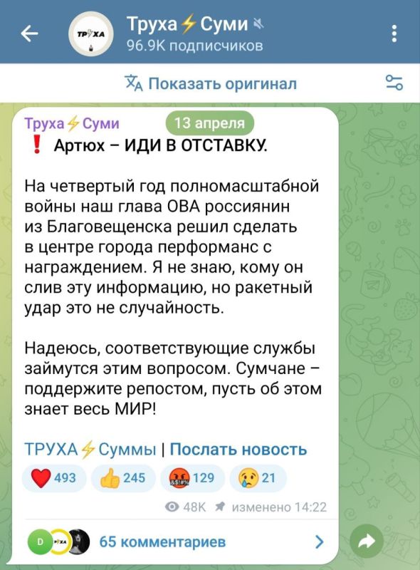 Крайним за удар по Сумам видимо сделают гауляйтера Артюха. Уже на различных укро-помойках пошли призывы снять Артюха за то, что он организовал сборище ВСУшников в Сумах по которому прилетела ракета.