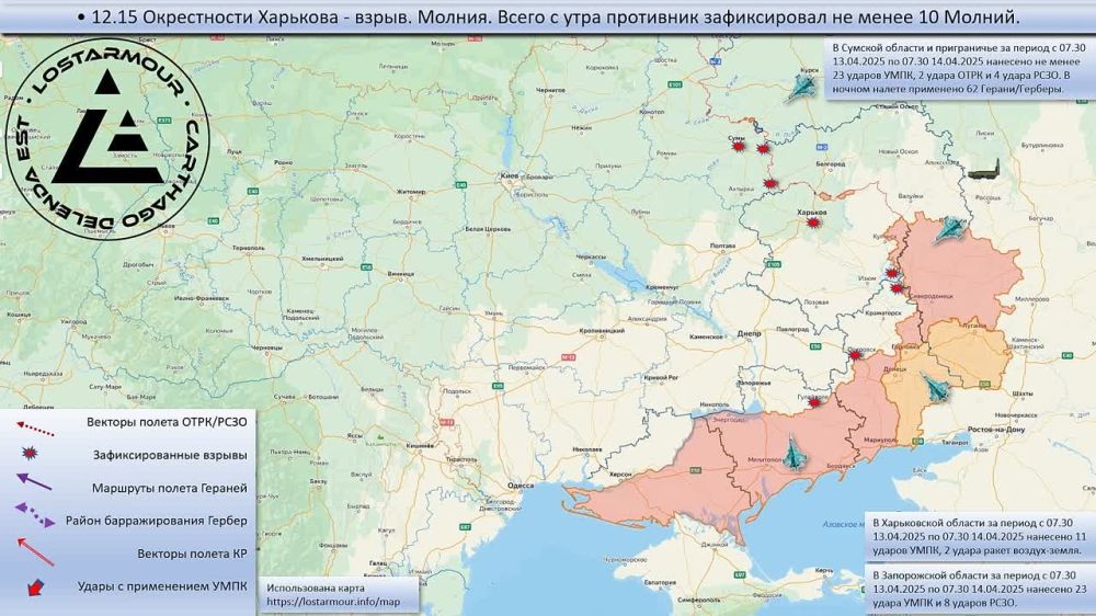 Анимированная схема ударов по территории Украины 13-14 апреля 2025 года