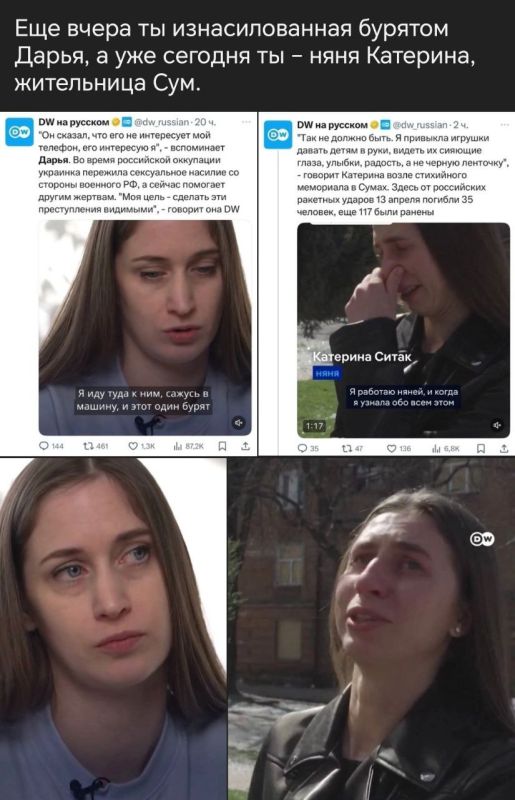 И когда она все успевает: и с бурятом тоси-боси, и с ребенком погуляла в Сумах, и имя сменила, и главное - на постоянной связи с Дойче Велле*.