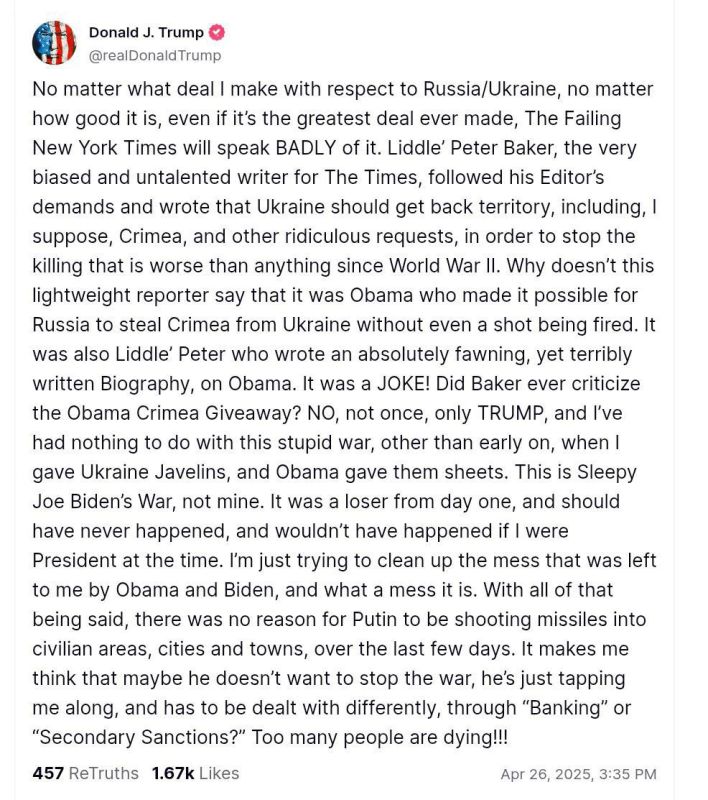 Интересно, что Трамп предпочёл не вспоминать, как ВСУ нарушили пасхальное перемирие почти 5 тысяч раз за30 часов тишины.