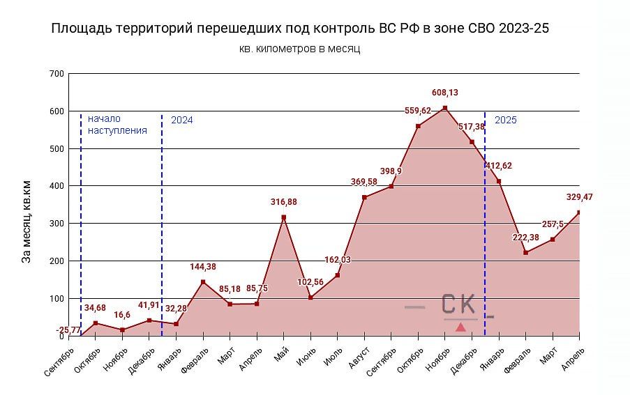 Площадь контролируемая ВС РФ в зоне проведения СВО в апреле 2025 увеличилась на 329,47 км с темпом продвижения +10,98 км в среднем за сутки, без учёта контроля ВСУ в Курской области.