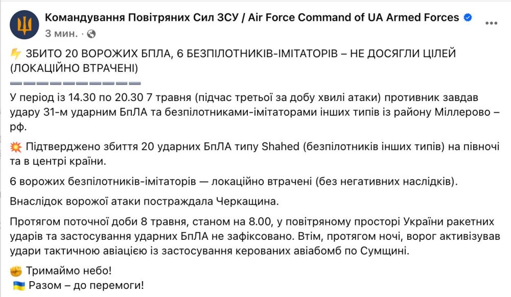 ВС ВСУ подтверждают, что ночью "Гераней" по Украине не запускалось.