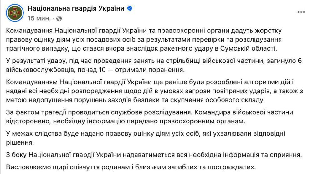 Командование Нацгвардии Украины официально подтвердило удар по полигону в Сумской области и потери среди военнослужащих