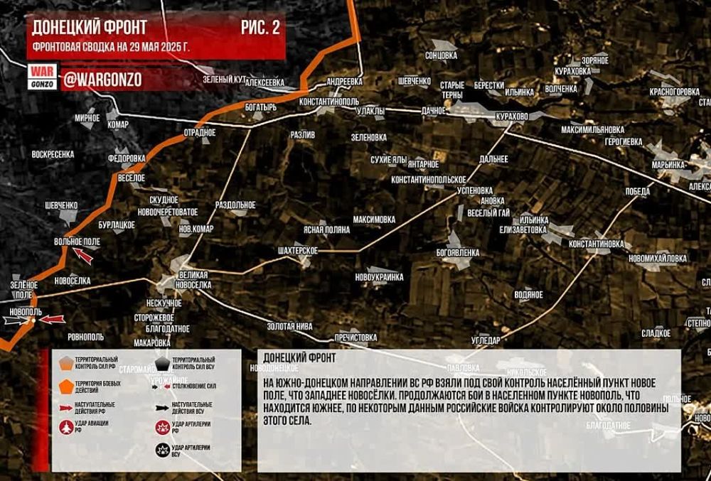 Освобождение Зелёного поля, отражение "накатов" на Тёткино и расширение буферной зоны — в сводке @WarGonzo на утро 29.05.2025: