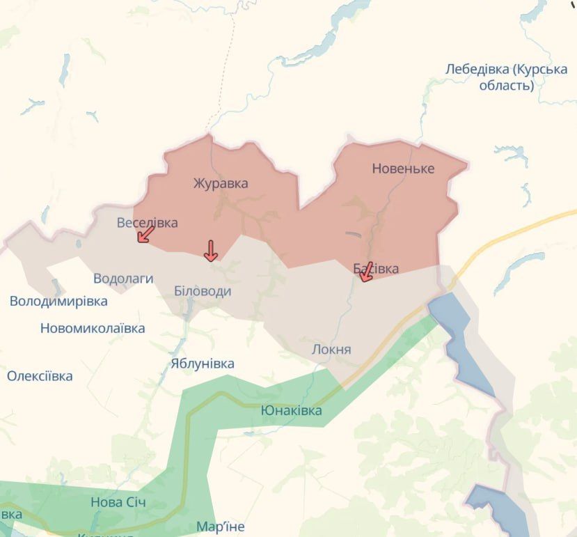 По его данным, войска России наступают по линии от Владимировки до Локни, граничащей с Юнаковкой. Эксперт отмечает, что, «к сожалению, Беловоды и Локня уже фактически под контролем врага», а аналитики возглавляемого им проекта уже фиксируют российские боевые группы всего в 230 метрах от Юнаковки.