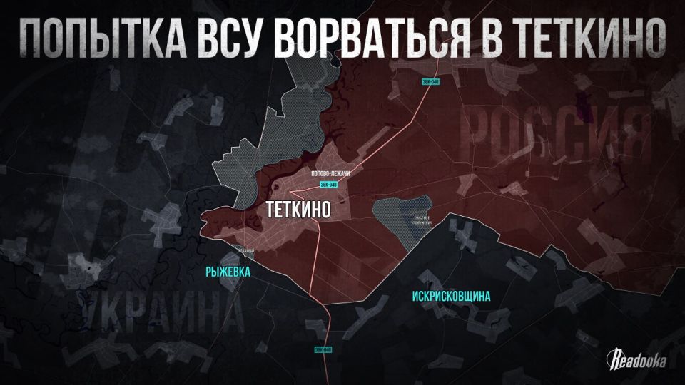 ВСУ ведут атаку сразу по нескольким направлениям, пытаясь максимально сковать в маневре наши силы прикрытия границы. В частности, украинцы атакуют со стороны сел Рыжевка и Искрисковщина. Задача неприятеля очевидна — отрезать наш гарнизон в Теткино от сообщения с тылом по трассе 38К-040. При этом украинские штурмовые группы сумели закрепиться у приграничных водоочистных сооружений в 3 км к юго-востоку от Теткино. Противник пытается развить успех и заскочить в прилегающее к поселку село Попово-Лежачи — так он, судя по всему, хочет перерезать шоссе 38К-040: это его главная задача.