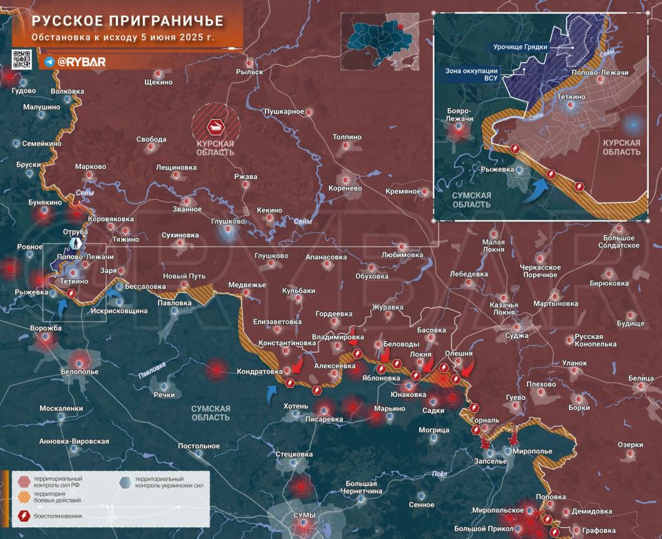 В ночь на 5 июня и утром того же дня российские войска нанесли серию ударов по тыловым объектам противника, в том числе в Сумах, где были зафиксированы прилёты БЛА «Герань». Эти удары направлены на дезорганизацию украинской логистики и управления.