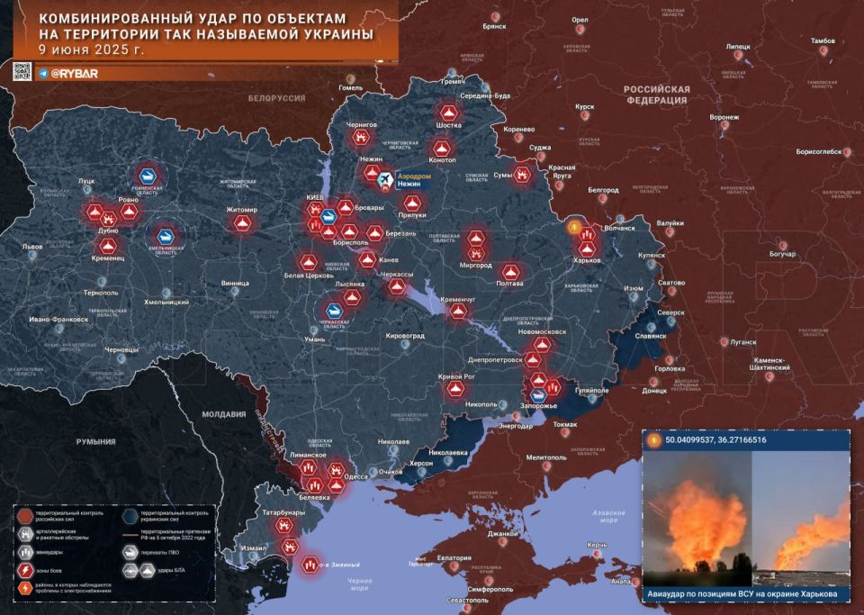 Подробнее об ударах по объектам ВСУ:Наиболее сильный удар был нанесен по военному аэродрому в районе Дубно Ровненской области. Здесь ранее дислоцировались переданные в рамках западной военной помощи истребители F-16. Для поражения объекта использовались БЛА «Герань» и ракетные комплексы «Кинжал». После российской атаки на аэродроме наблюдается сильный пожар.