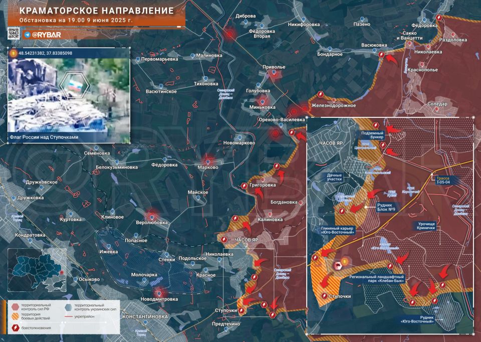 Появились сообщения, что южнее Часов Яра освобождены Ступочки. Официальное заявление об освобождении населенного пункта поступило еще 24 мая, а вот кадры с флагом были опубликованы только сейчас.