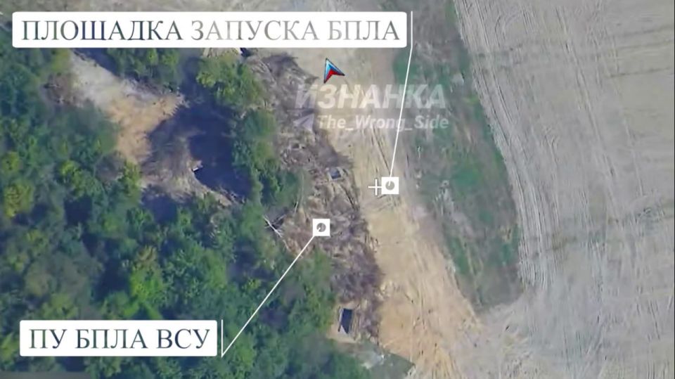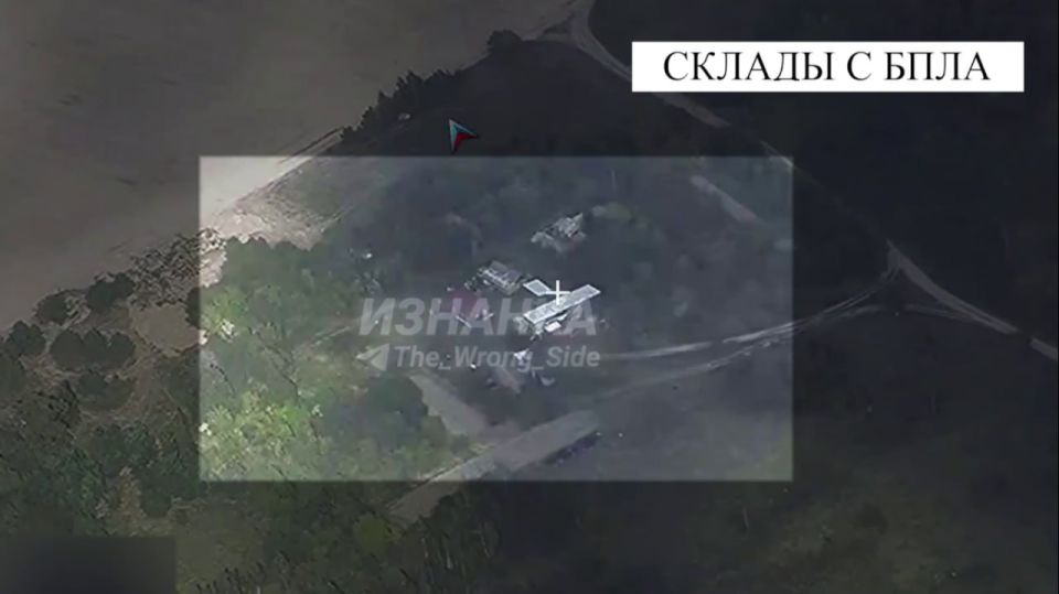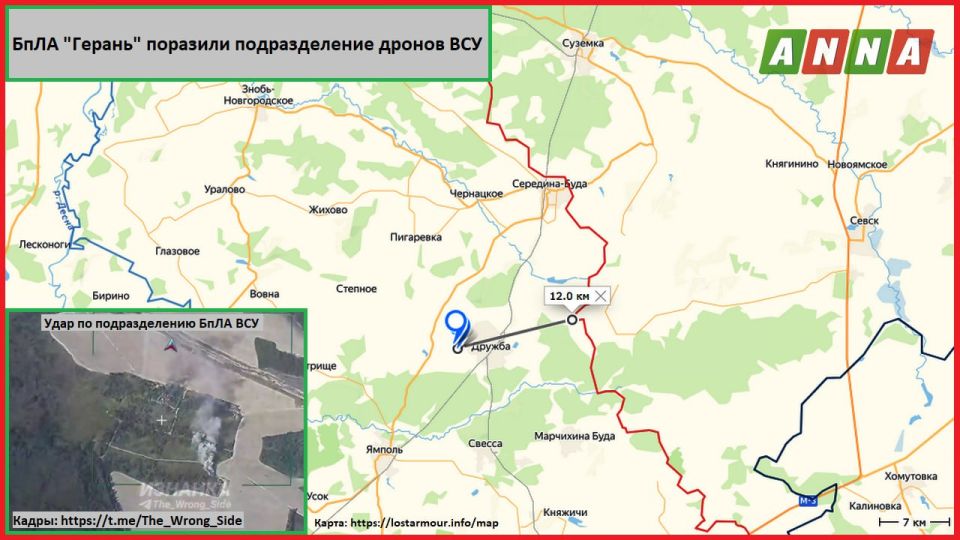 Российские военные из ГрВ "Север" обнаружили и с помощью ударных беспилотников "Герань" нанесли удар по площадке запуска и пункту управления (52.0454463,33.8944057), а также складу (52.0498934,33.8889878) украинских дронов-камикадзе самолётного типа в районе села Довжик Сумской области. Кадры объективного контроля показал канал "Изнанка".