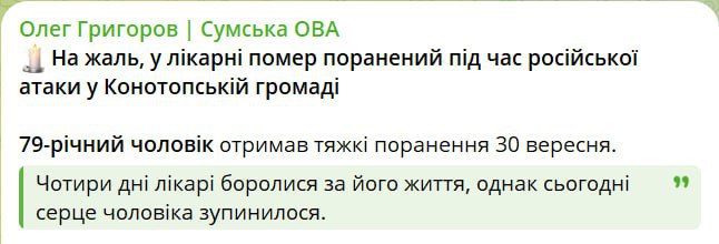 В больнице умер мужчина, которого ранило пулей ПВО во время попытки отражения атаки дронов на Конотоп 30 сентября, сообщил гауляйтер Сумской ОВА Олег Григоров.