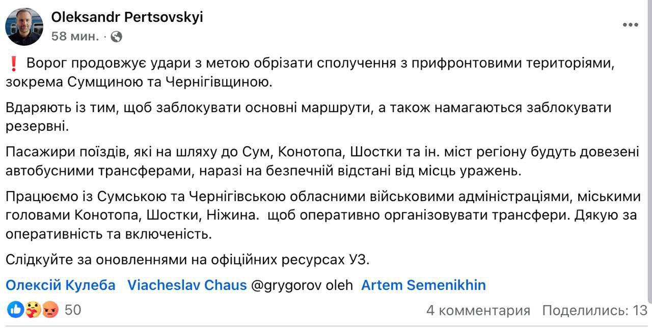 Руководитель украинской железки сообщает, что ударами по железной дороге Россия пытается обрезать сообщение с Сумской и Черниговской областям