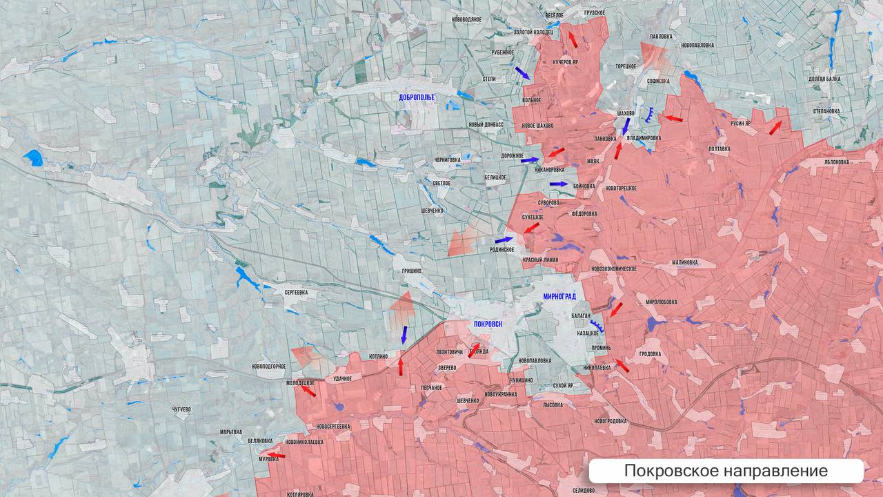 На Покровском фронте, установив контроль над ж/д развязкой западнее Покровска, ВС РФ продвигаются в сторону Сергеевки, а также взяли под контроль микрорайон на северо-западной окраине города. В самом Покровске наши наращивают присутствие в центре города, в глубине городской застройки: битва идёт за каждый подъезд, ВСУ яростно сопротивляются. Наши установили контроль над ж/д вокзалом, а в сети расходятся кадры сдачи в плен ВСУшников в центре Покровска. Идёт штурм Мирнограда: на севере кипят бои за многоэтажки, при этом ВС РФ наступают также с востока – вдоль улицы Шоссейная, и с южной окраины. В районе «Добропольского выступа» без изменений.
