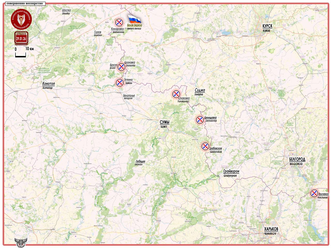 А 29 января восточнее района Комаровка взят под контроль н.п. Белая Береза (51°4333 с. ш. 34°2157 в. д. - население 14 чел. в 2001 г.). Этот населенный пункт вытянут вдоль границы, с востока на запад, на 3 километра.
