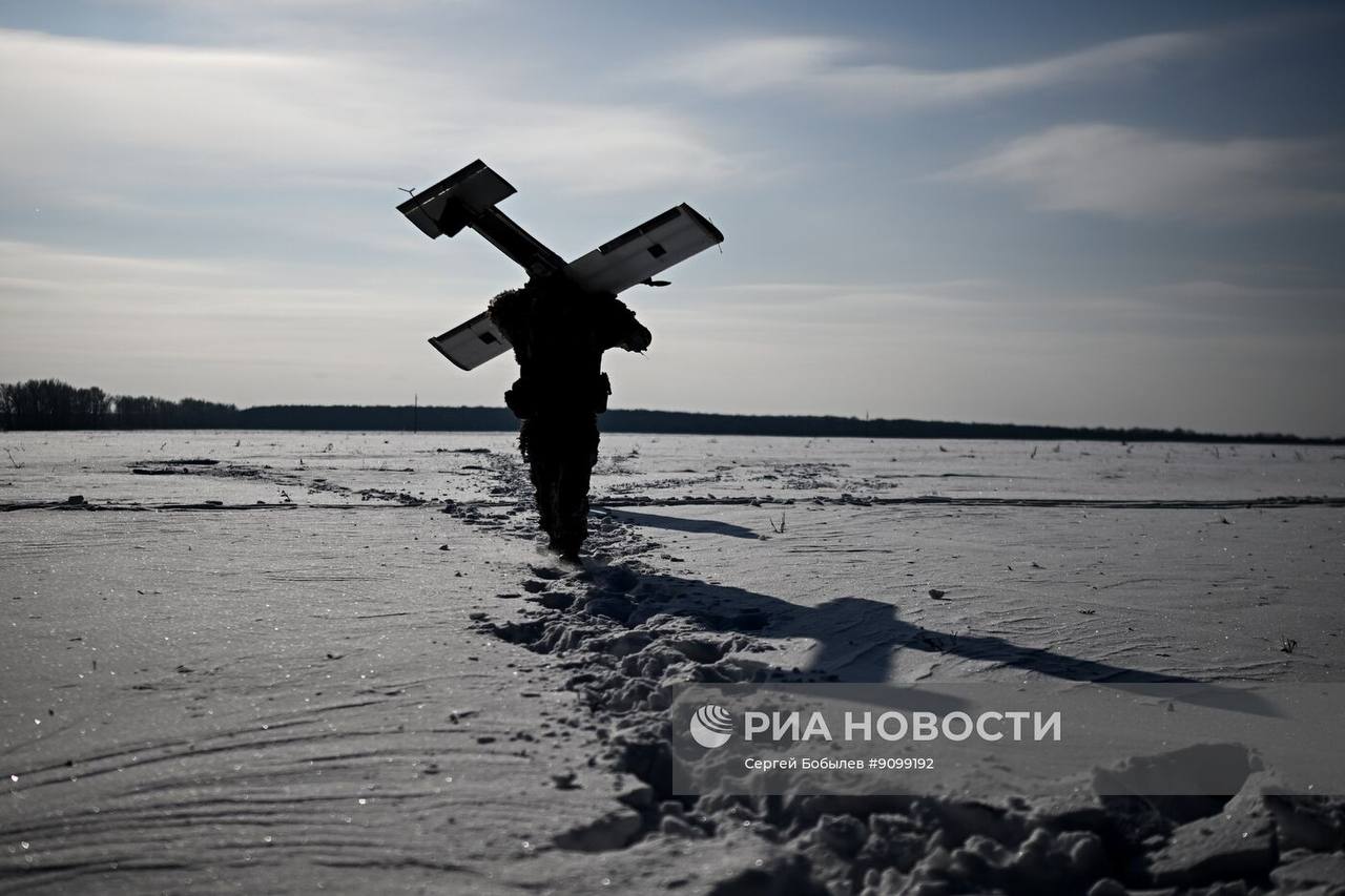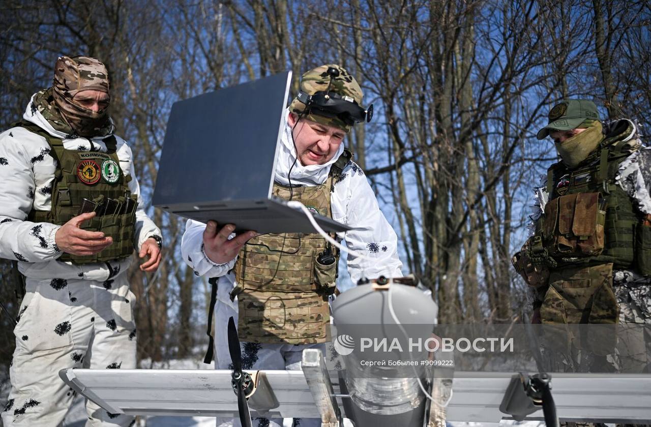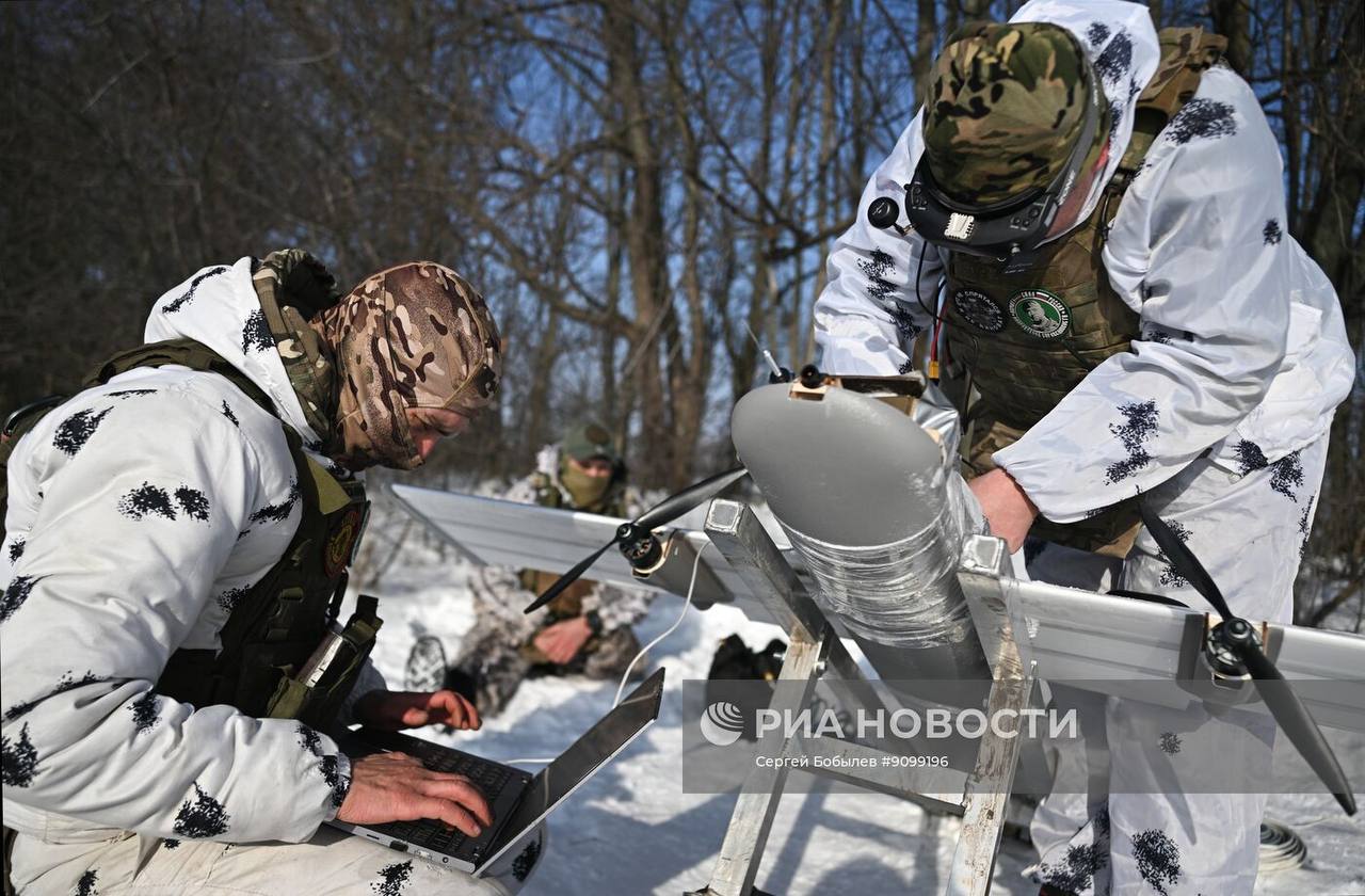 Кадры боевой работы расчёта FPV-дронов самолётного типа «Молния-2» батальонной тактической группы «Каштана» спецназа «АХМАТ» МО РФ на Сумском направлении