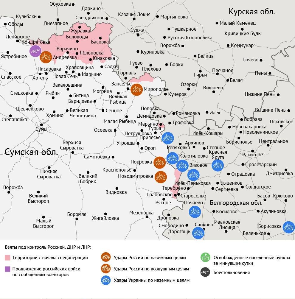 По данным военкоров, наши бойцы ворвались в село Кондратовка в Сумской области и закрепились на его окраинах — бои продолжаются. Также в ДНР не утихают сражения за Константиновку и Красный Лиман.
