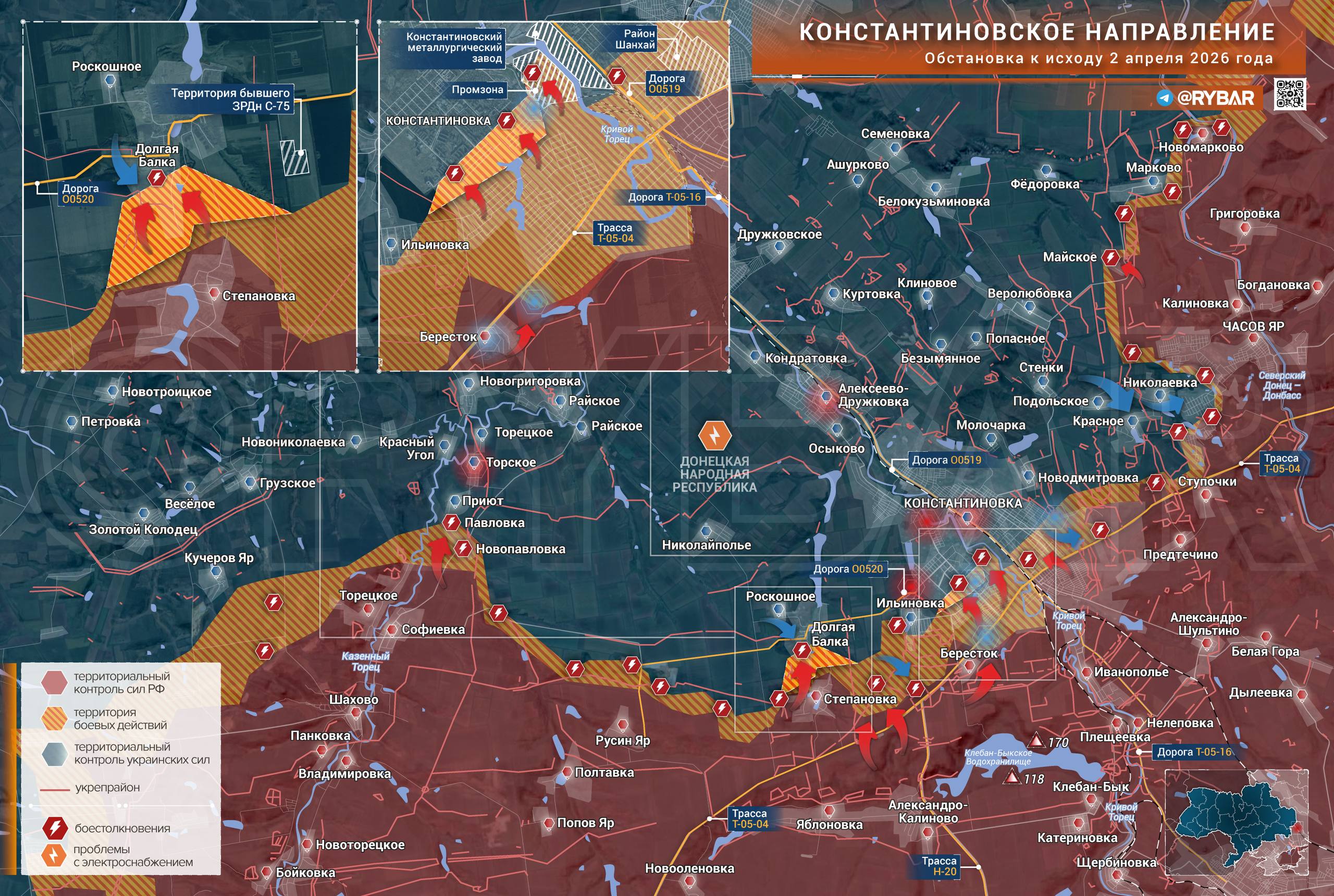 На Константиновском направлении российские войска завязали бои на подступах к Долгой Балке. Также боестолкновения продолжаются в центре самой Константиновки, где противник стремится удержать территорию промзоны на обоих берегах Кривого Торца.