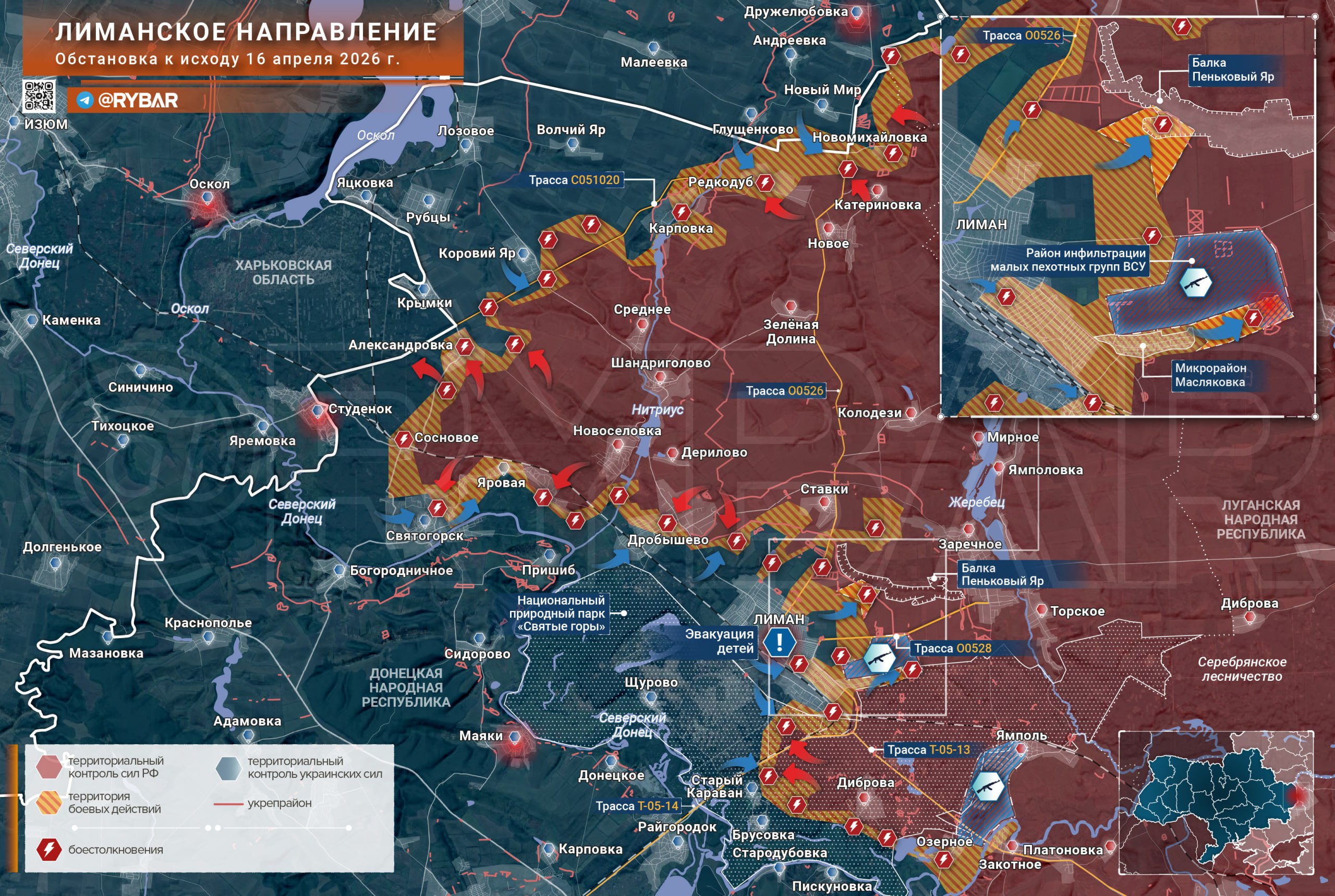 На Лиманском направленииукраинские формирования предпринимают контратаки в окрестностях Масляковки с целью просочиться сквозь порядки ВС РФ и расширить серую зону. Также противник пытается закрепиться на территории балки Пеньковый Яр с целью вернуть контроль над северо-восточными подступами к Лиману.