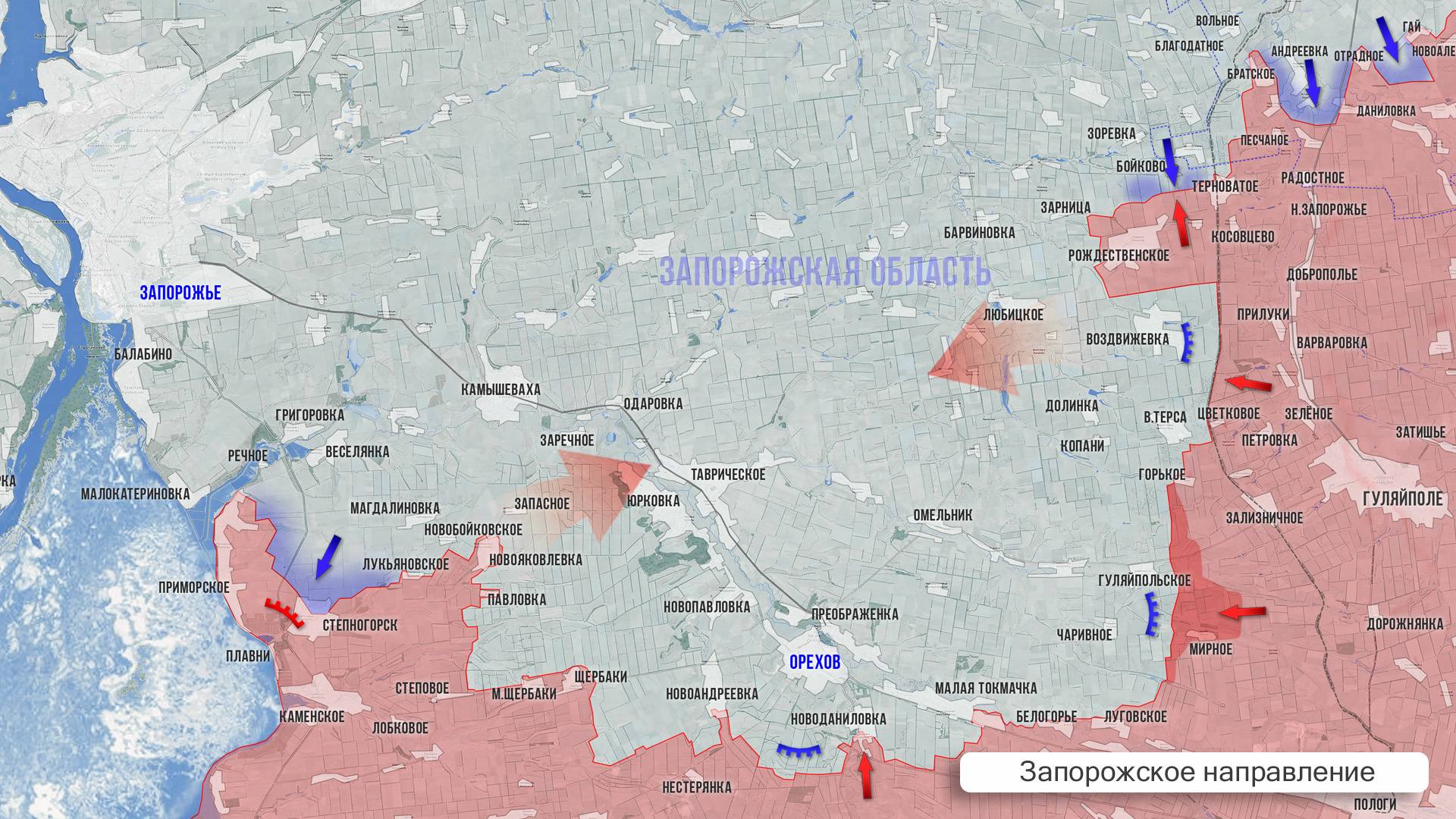 На западном фланге Запорожского участка продолжаются ожесточённые бои в районе Степногорска и Приморского. На восточном фланге ВС РФ ведут бои на подступах к Гуляйполю и в районе Верхней Терсы и Воздвижевки. Наши бойцы продолжают расширять клин в обороне противника между этими посёлками, а также усилили обстрелы тяжёлой артиллерией по пунктам управления дронами и огневым точкам врага в районе сёл Копани-Долинка-Ровное. Удары наносятся по целям в Любицком и Зарнице.