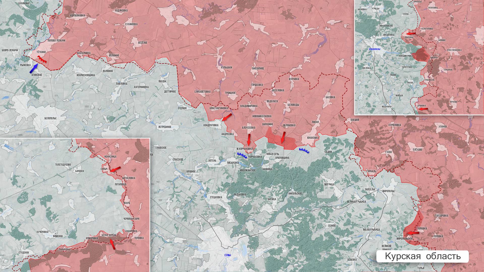 В Сумском приграничье в Краснопольском районе противник пытался контратаковать к востоку от Таратутино, штурмовые группы были практически целиком уничтожены. В районе Новодмитровки продвижение до 500 м. Тактические успехи есть в районе Мирополья. ВС РФ заняли высоты у Малой Корчаковки и фактически зачистили лес между ней и Корчаковкой. Севернее Новой Сечи лес остаётся за противником, по нему активно работают наши артиллерия и авиация. В Глуховском районе есть тактические продвижения.