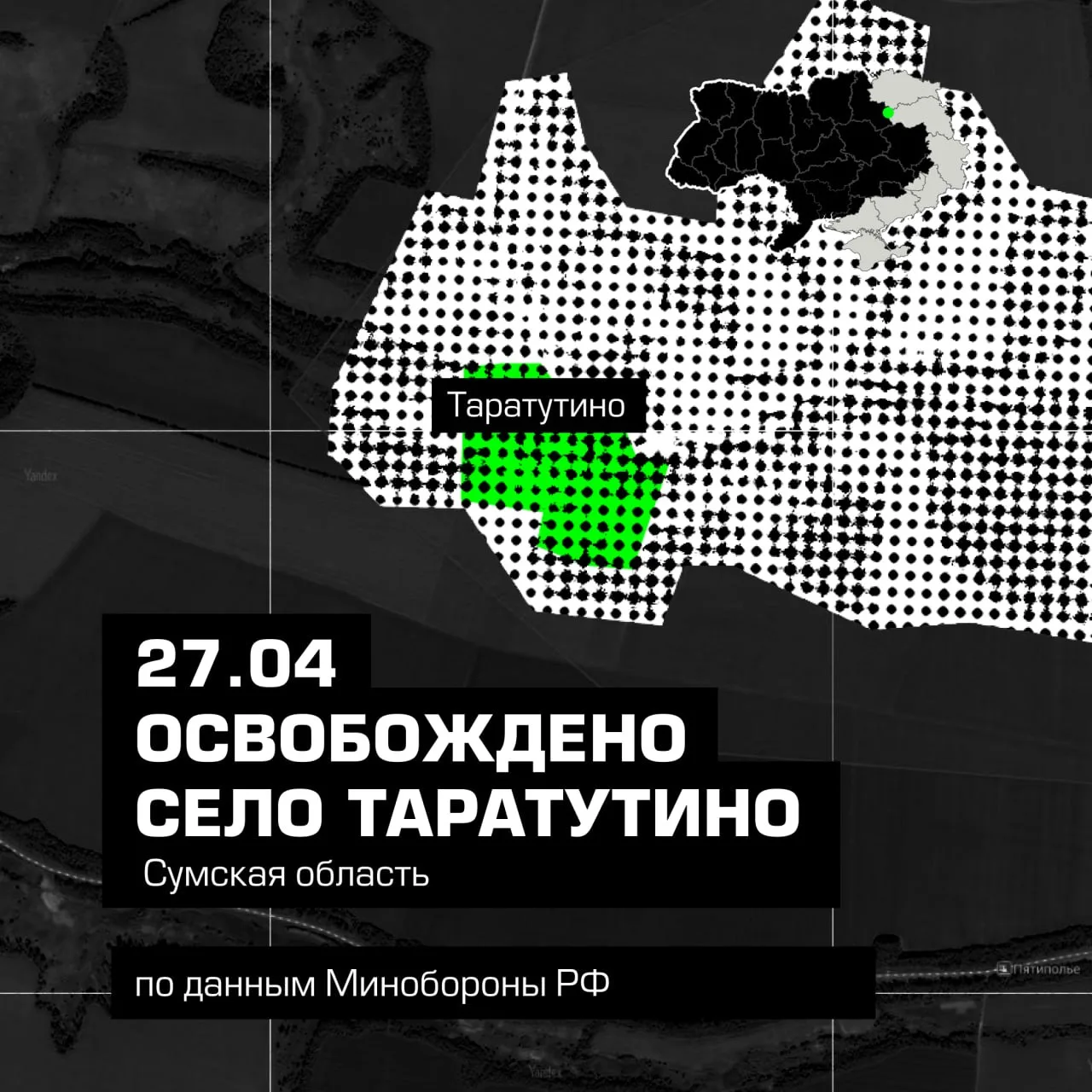 Спецоперация: ВС РФ освободили населённый пункт Таратутино в Сумской области, сообщили в Минобороны РФ.